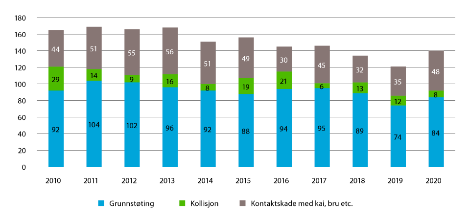 Det har ifølge Sjøfartsdirektoratets registreringer vært en nedgang i antall navigasjonsulykker med næringsfartøy den siste tiårsperioden, fra rundt 165 pr. år i 2010–2013, til 121 i 2019 og 140 i 2020, jf. figur 7.8. En navigasjonsulykke er enten en grunnstøting, kollisjon mellom skip eller kontaktskade med kai, bru eller andre installasjoner. Foreløpige tall for 2020 er 84 grunnstøtinger, åtte kollisjoner og 48 kontaktskader.