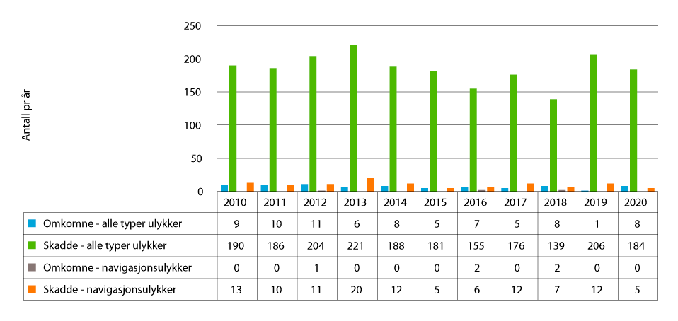 I 2020 omkom 20 personer i ulykker med fritidsfartøy. Dette er en tydelig reduksjon fra gjennomsnittet for 2012–2019, som er på 28 omkomne. Sjøfartsdirektoratets registreringer viser at antallet registrerte ulykker med fritidsfartøy har ligget i overkant av 30 pr. år fra 2012 til 2019, men ble doblet til 64 i 2020. Antallet registrerte skadde var i gjennomsnitt fire pr. år i 2012–2019, men økte til 53 i 2020. Den markante økningen i antallet registrerte ulykker og skadde i 2020 kan mest sannsynlig forklares med økt registrering og fokus på å innhente opplysninger om alle ulykker, ikke bare dødsulykkene.