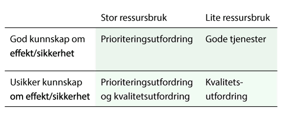 Prioritering av helse- og omsorgstjenestens ressurser står i tett sammenheng med tjenestenes kvalitet og pasientsikkerhet. Meld. St. 9 (2023–2024) Nasjonal helse- og samhandlingsplan 2024–2027 påpeker at god kvalitet er å utnytte ressursene i helse- og omsorgstjenesten på en slik måte at pasienten, brukeren og samfunnet får størst mulig helsegevinst. God ressursutnyttelse innebærer planlegging slik at det kan tilbys virkningsfulle, trygge og sammenhengende tjenester til riktig tid og på riktig nivå. Kunnskapsbasert praksis innebærer å ta faglige avgjørelser basert på forskningsbasert og erfaringsbasert kunnskap og pasientens og brukerens egen kunnskap. Denne kunnskapen er også viktig for gode prioriteringer. Figur 2.1 viser sammenheng mellom kunnskapsgrunnlaget, prioritering og kvalitetsforbedring.