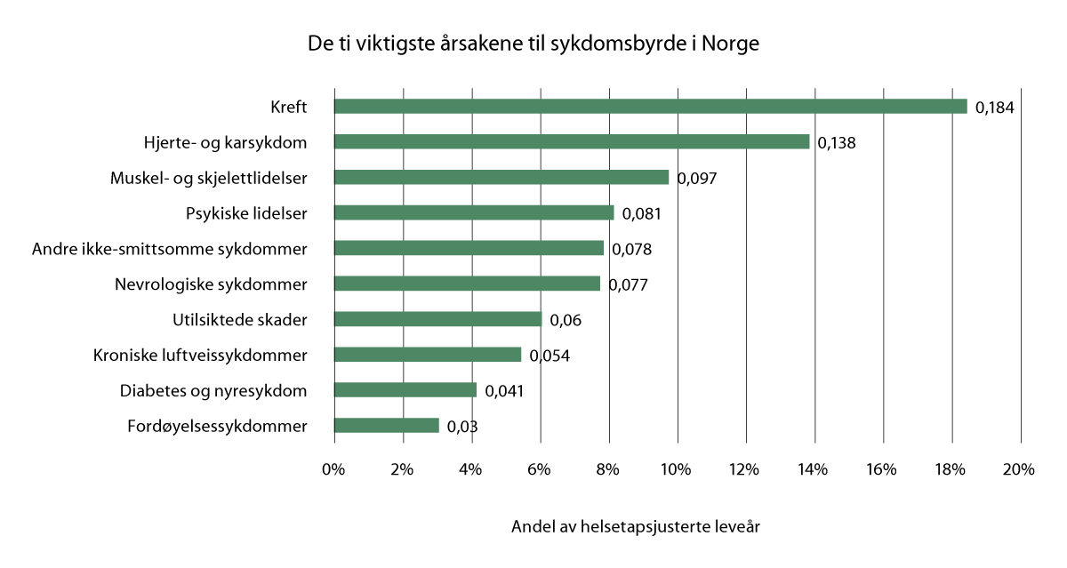 Helsen i befolkningen i Norge er generelt god og levealderen er høy, men det er fremdeles store sosiale helseforskjeller. De som har lang utdanning og god økonomi, lever lenger og har færre helseproblemer enn de som har kortere utdanning og dårligere økonomi. Sykdomsbildet i Norge er dominert av ikke-smittsomme sykdommer som forårsaker omtrent 87 prosent av den totale sykdomsbyrden. Ikke-smittsomme sykdommer som hjerte- og karsykdommer, kreft, kols, rusmiddellidelser, psykiske lidelser og demens er viktige årsaker til tapte leveår hos begge kjønn i Norge.