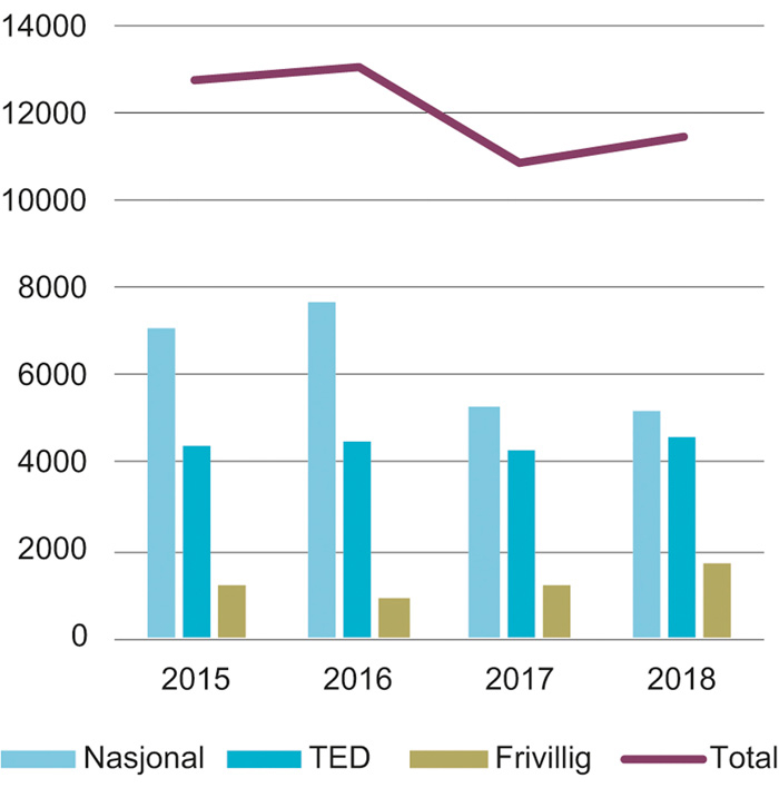 Tall fra Doffin viser at etter at den nasjonale terskelverdien ble hevet i 2017, har det totale antallet kunngjøringer som forventet gått noe ned, se figur 5.1. Antallet frivillige kunngjøringer har samtidig økt fra 941 frivillige kunngjøringer i 2016, til 1 353 i 2017 og 1 733 i 2018.