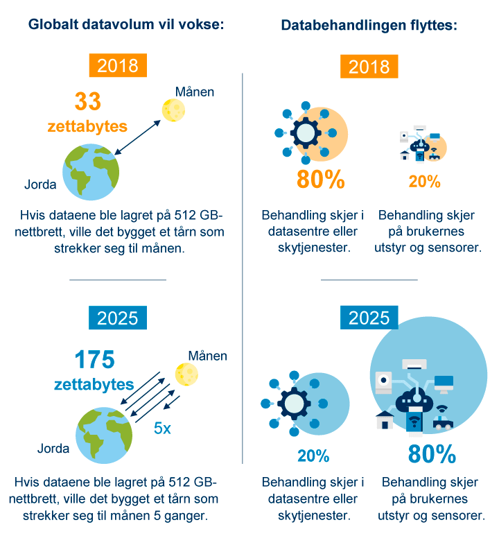 Når disse objektene brukes i tjenester som er avhengige av å gjøre beregninger i sanntid, for eksempel autonome kjøretøy eller avanserte produksjonsprosesser, må databehandlingen ofte gjøres lokalt på objektet («edge computing») – altså på selve kjøretøyet eller i et sensornettverk i industrien. Slike nettverk vil ofte bruke 5G for rask og sikker kommunikasjon. Ettersom «edge computing» får større utbredelse, og datavolumene vokser, vil en vesentlig mindre andel av den totale datamengden bli behandlet i skytjenester og sentraliserte systemer, se figur 1.2.