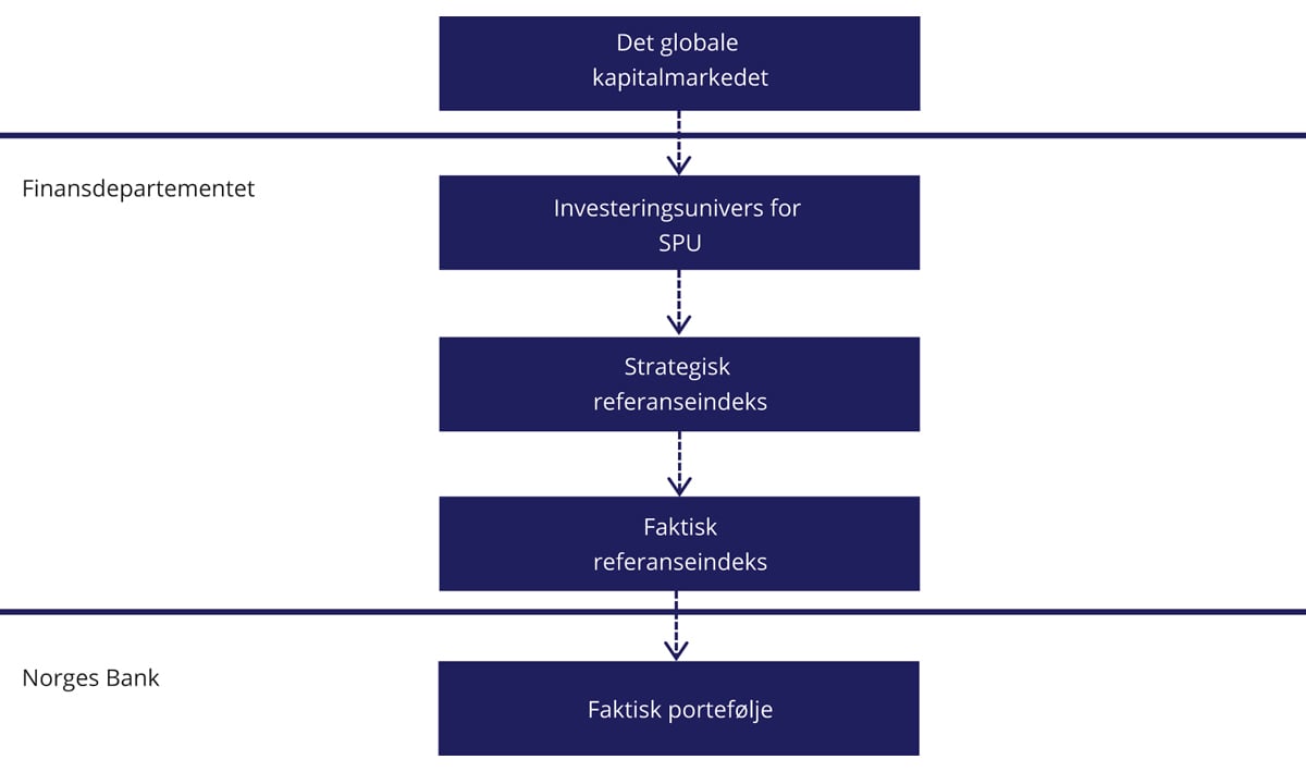 Referanseindeksen til SPU er basert på indeksen FTSE Global All Cap. Denne indeksen tar utgangspunkt i den totale markedskapitaliseringen til selskapene som inngår, men hvor kapitaliseringen til det enkelte selskap deretter justeres for blant annet likviditet, begrensninger på utenlandsk eierskap og såkalt fri flyt. Departementet har tilordnet geografiske justeringsfaktorer til FTSE Global All Cap-indeksen ut ifra selskapenes regiontilhørighet: utviklede markeder i Europa, utviklede markeder i Nord-Amerika, øvrige utviklede markeder og fremvoksende markeder. Justeringsfaktorene påvirker eierandelene i alle selskapene i den enkelte region.