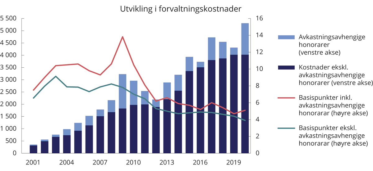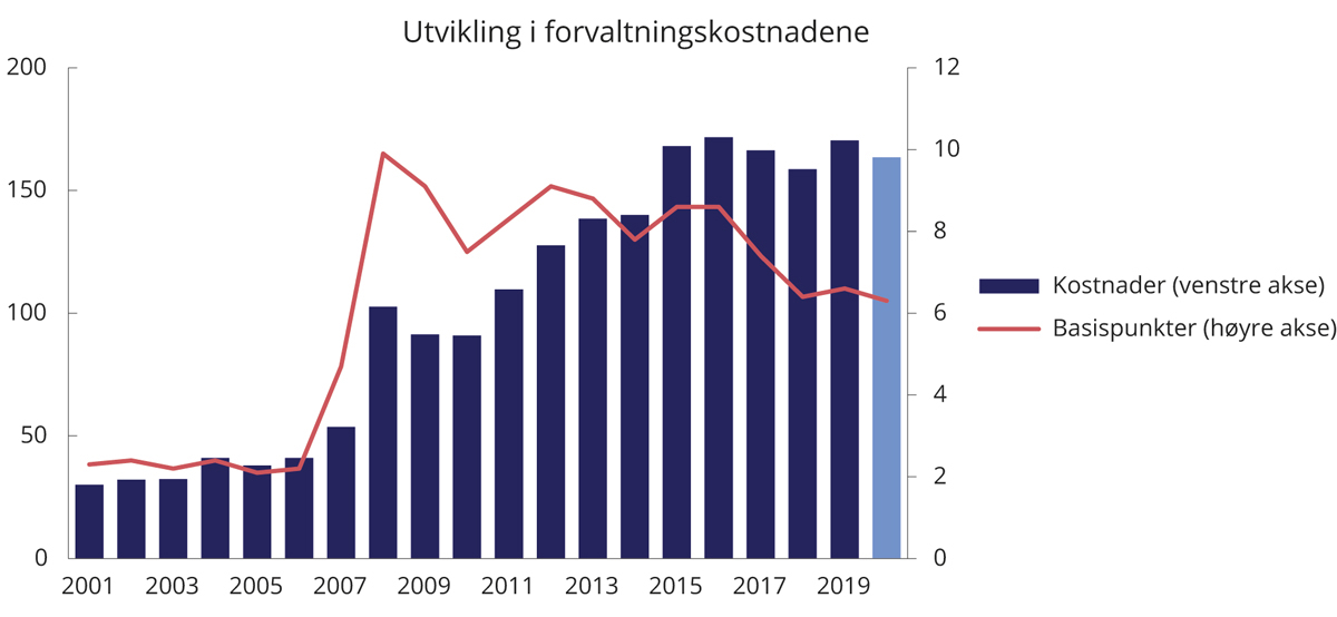 Målt som andel av forvaltningskapitalen, var kostnadene i fjor 5,1 basispunkter i SPU og 6,3 basispunkter i SPN.
