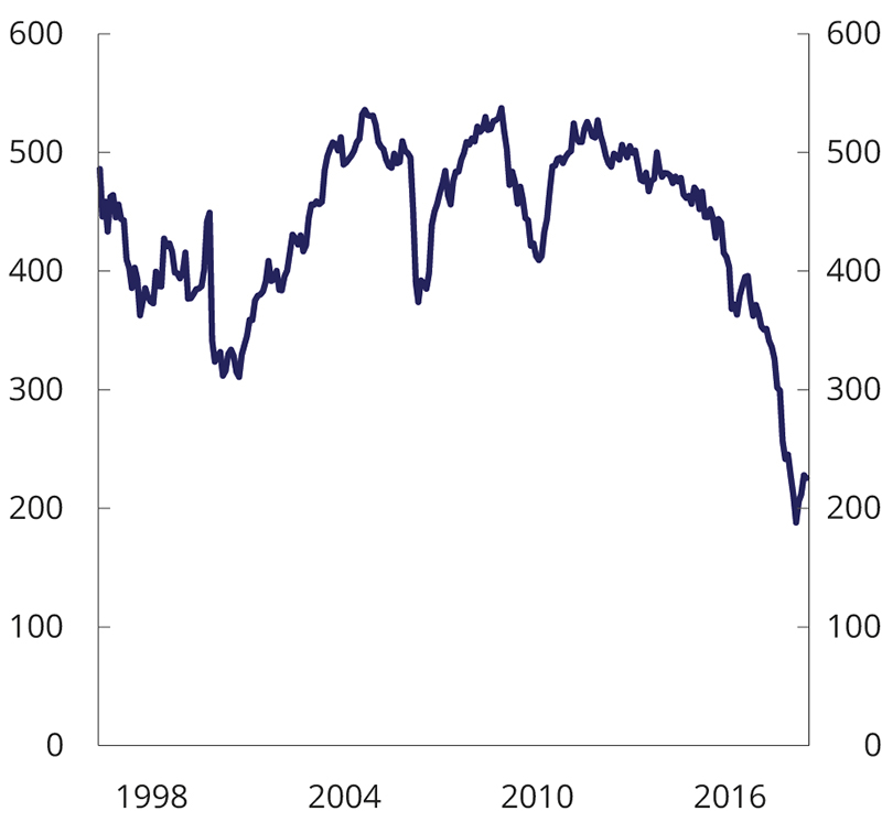 1 Anslaget for forventet realavkastning av SPU ble i 2017 redusert fra 4 pst. til 3 pst.