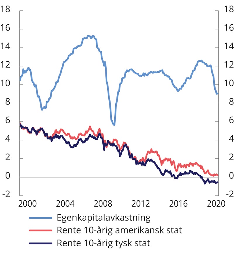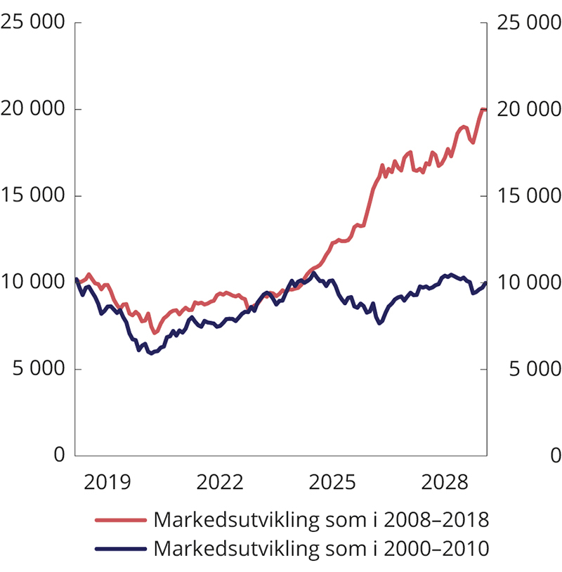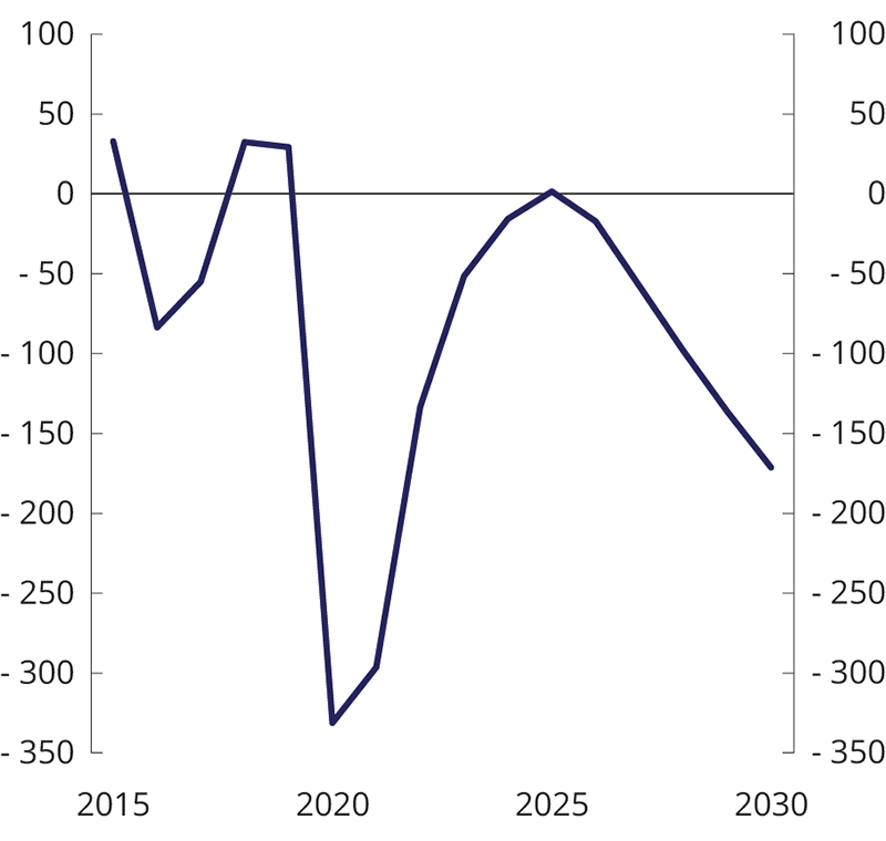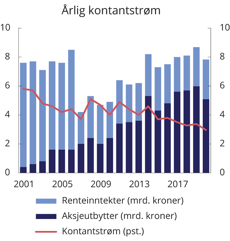 En sterk vekst i fondskapitalen har de to siste tiårene gitt rom for en betydelig økning i bruken av olje- og fondsinntekter i statsbudsjettet. Lavere petroleumsinntekter vil etter hvert gi mindre vekst i fondskapitalen og dermed redusert handlingsrom i finanspolitikken, jf. Perspektivmeldingen 2021.2 Historisk har betydelige netto tilførsler av petroleumsinntekter til fondet medført at fondsverdien har steget, også i perioder med kraftige fall i aksjemarkedene. Fremover må vi være forberedt på at det kan komme perioder uten vekst i den nominelle verdien av fondet. Uten utsikter til store netto avsetninger til fondet vil utviklingen i fondsverdien i større grad bestemmes av utviklingen i de globale finansmarkedene. I takt med at en stadig større del av velferden er blitt finansiert med avkastningen av fondsmidlene, er offentlige finanser blitt mer sårbare for svingninger i internasjonale finansmarkeder. Dagens lave rentenivå bidrar isolert sett til lav forventet avkastning fra fondets obligasjonsinvesteringer. Fremtidig avkastning fra aksjer er også usikker, og de langsiktige effektene av koronapandemien gjør usikkerheten større enn normalt. Økt sårbarhet og utsikter til mindre vekst i fondet fremover tilsier at vi må være varsomme i den videre innfasingen av fondsinntekter i norsk økonomi.