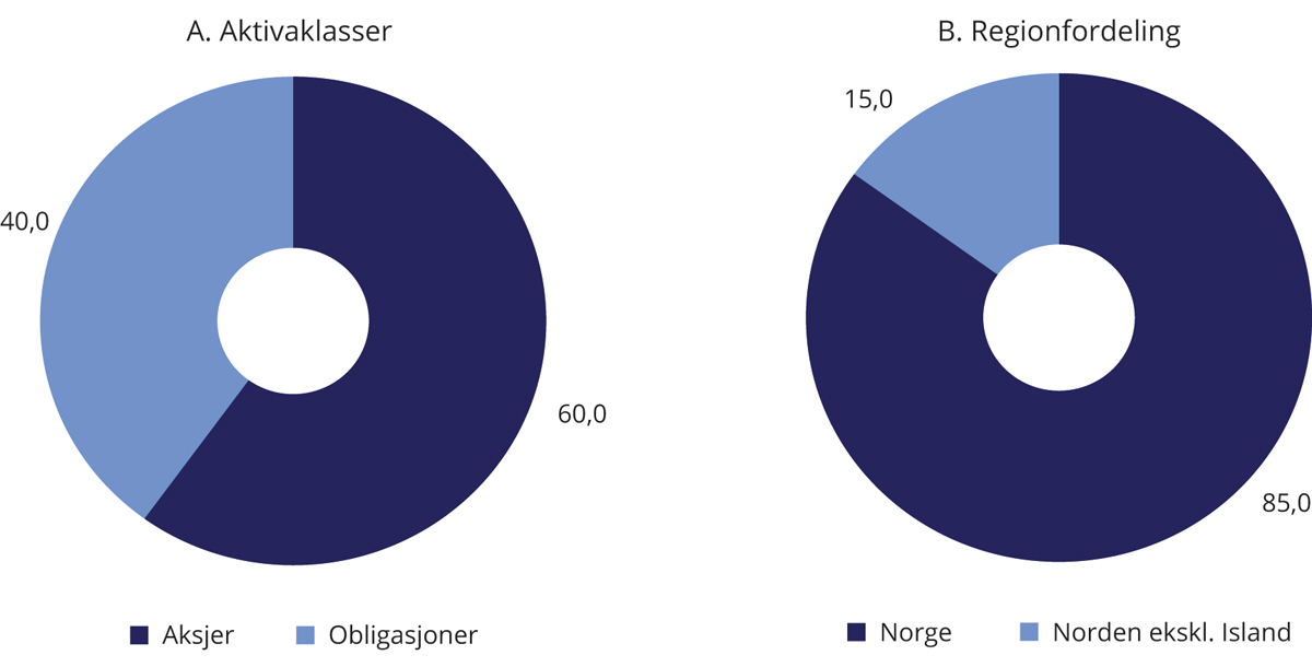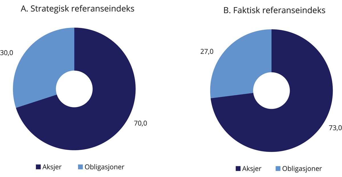 Investeringsstrategien for SPU og SPN er utviklet over tid, basert på grundige vurderinger, faglige utredninger og praktiske erfaringer. Viktige veivalg er blitt forankret i Stortinget. Strategien er definert i fondenes mandater og uttrykkes blant annet gjennom sammensetningen av referanseindeksene fastsatt av Finansdepartementet. Den strategiske referanseindeksen angir en fordeling av kapitalen mellom aksjer og obligasjoner, og er et uttrykk for eiers investeringspreferanser og risikotoleranse. For SPU utgjør andelen aksjer i referanseindeksen 70 pst., mens andelen er 60 pst. for SPN. Obligasjoner utgjør resten.