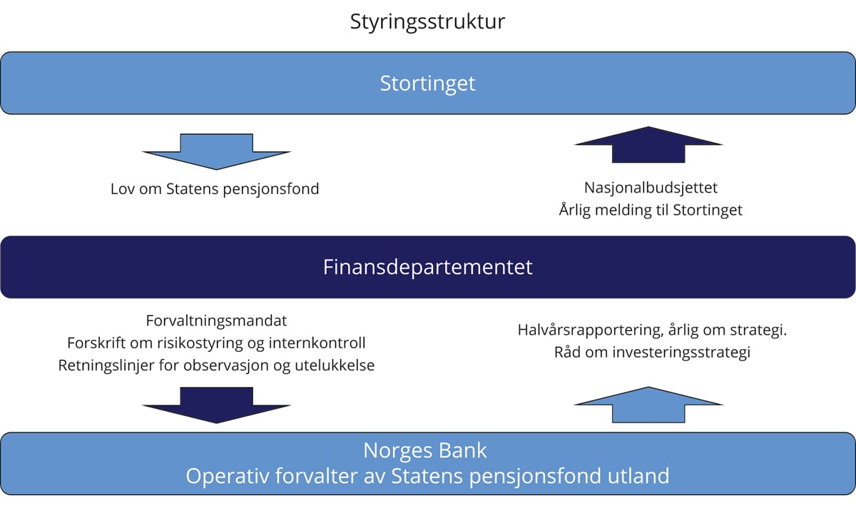 Investeringsstrategien og rammer for forvaltningen fastsettes av Finansdepartementet, og viktige veivalg forankres i Stortinget. Norges Bank og Folketrygdfondet tar beslutninger om enkeltinvesteringer og utøver fondenes eierrettigheter uavhengig av departementet. En klar rolledeling bidrar til å tydeliggjøre ansvar. Styringsstrukturen må sikre at overordnede beslutninger om avkastning og risiko og om rammene for den ansvarlige forvaltningen forankres hos fondets eiere, representert ved politiske myndigheter. Samtidig må det være tilstrekkelig delegering av fullmakter til at løpende beslutninger i forvaltningen tas nær markedene fondet investeres i.