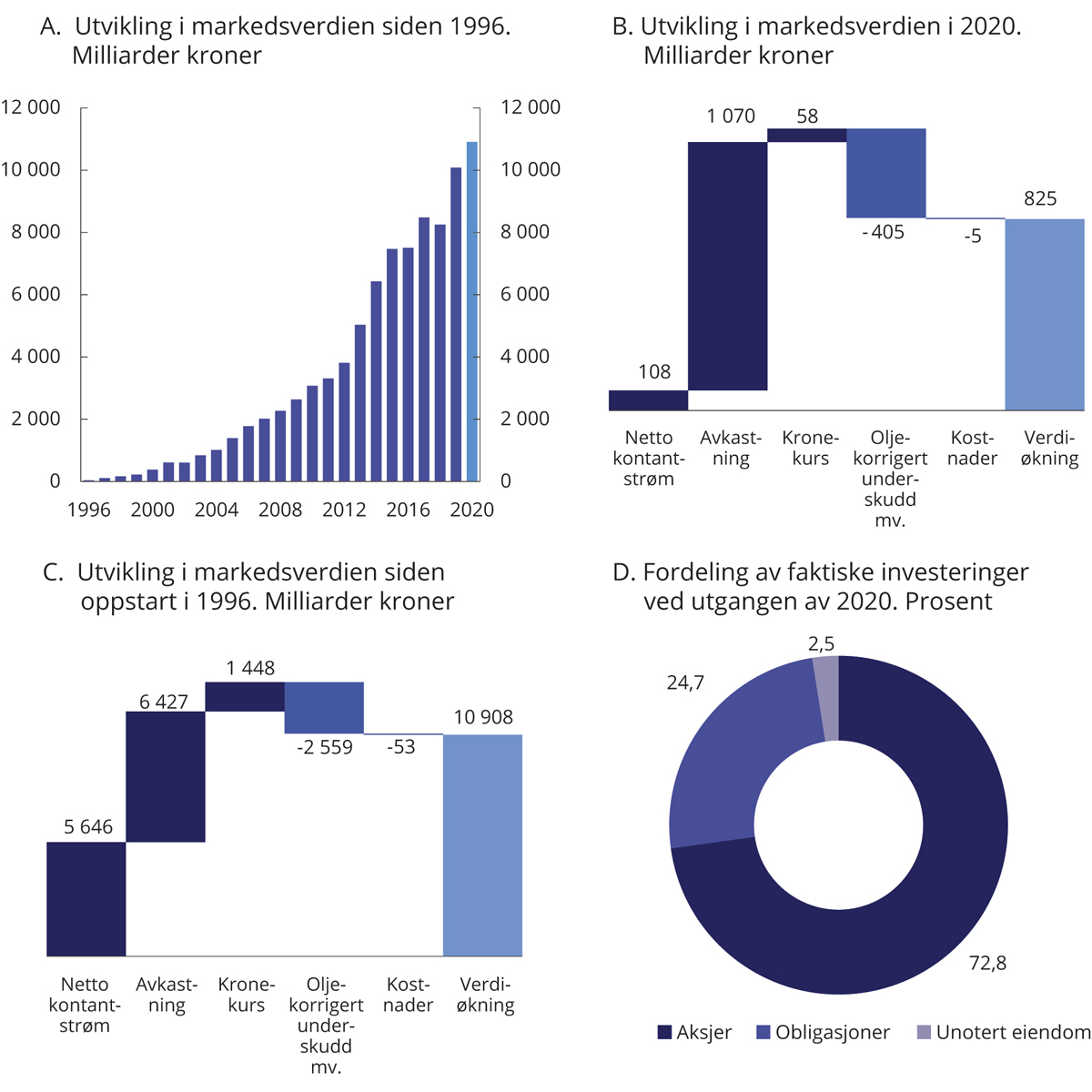 I beretningsdelen av årsrapporten for SPU oppgir Norges Bank en markedsverdi av investeringene på 10 914 mrd. kroner. Tallet er før fratrekk for forvaltningskostnader for 2020. Etter fratrekk for slike kostnader var verdien av fondet 10 908 mrd. kroner, se tabell 5 i årsrapporten for SPU og i rapportens «Oppstilling av endringer i eiers kapital» i regnskapsrapporteringen.