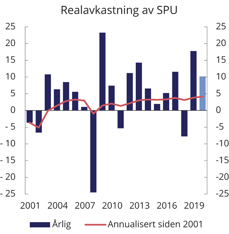 For å dempe de negative virkningene på økonomien av koronapandemien og tilhørende smitteverntiltak, iverksatte myndighetene i mange land gjennom 2020 omfattende finans- og pengepolitiske tiltak. Etter et betydelig fall i aksjemarkedet i første kvartal, bidro lave renter og store statlige støttetiltak til at aksjekursene steg kraftig gjennom resten av året. Avkastningen av SPU i 2020 var 10,9 pst. målt i fondets valutakurv. Det positive resultatet skyldes høy avkastning i aksjemarkedet og god avkastning for obligasjoner som følge av fallende renter. Fondsverdien økte i løpet av fjoråret med 825 mrd. kroner, til 10 908 mrd. kroner etter fradrag for kostnader.