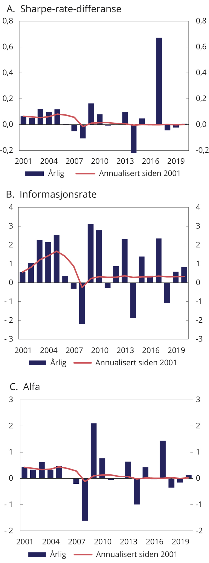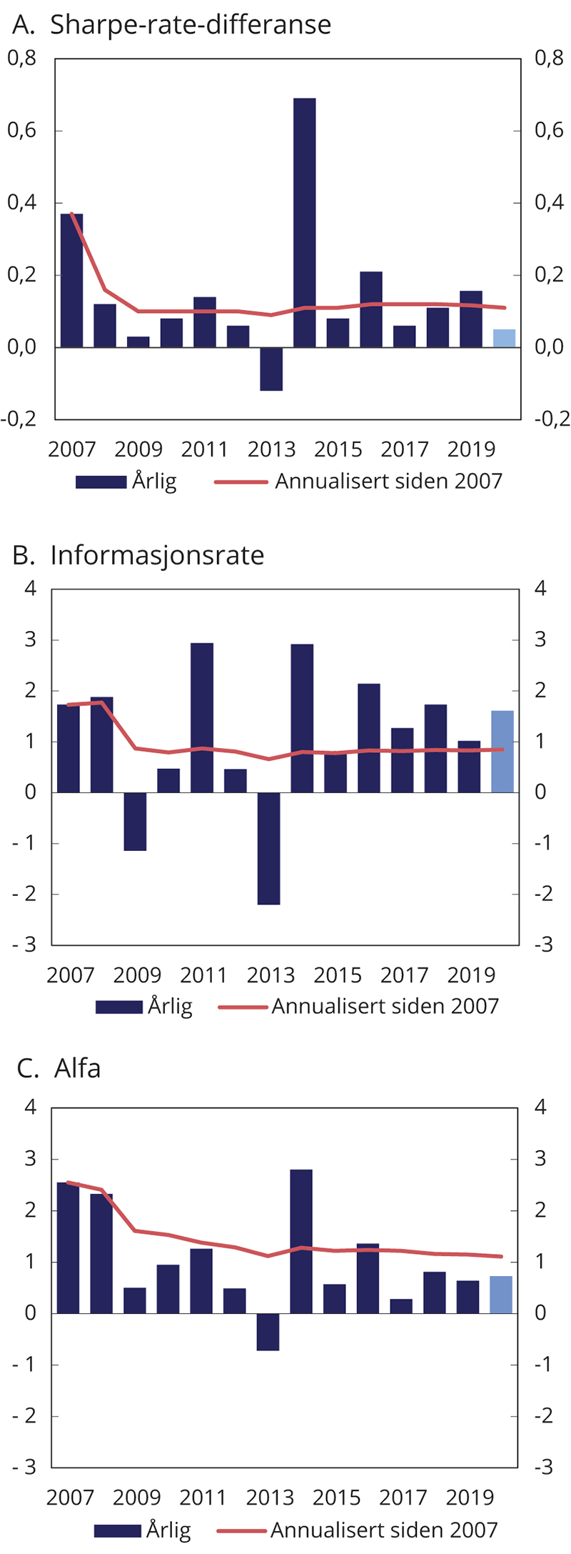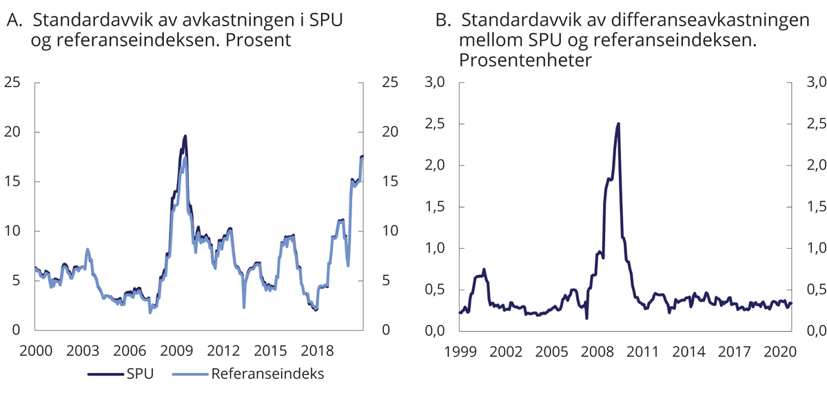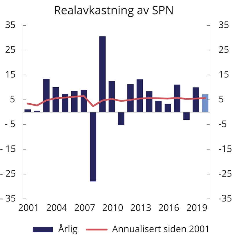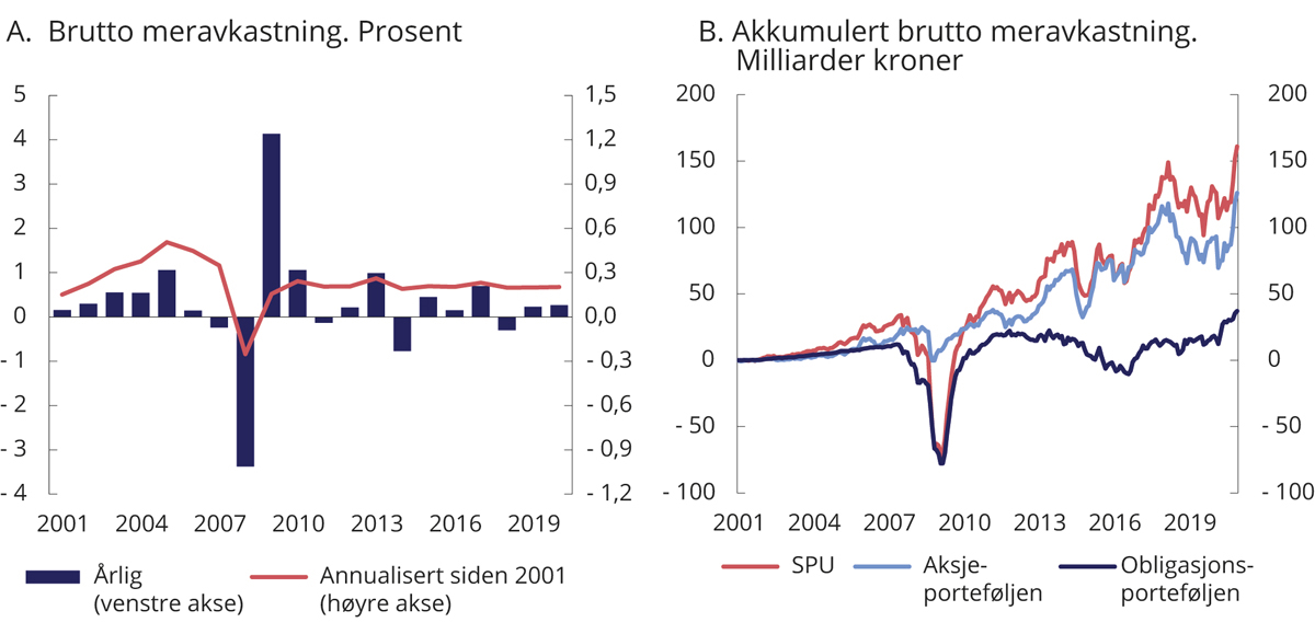 Akkumulert brutto meravkastning i mrd. kroner er beregnet som forskjellen mellom samlet kumulativ avkastning av henholdsvis SPN og fondets referanseindeks siden januar 2007, multiplisert med kapitalen i SPN ved inngangen til 2007. Beregningen angir dermed forskjellen i verdien av SPN ved utgangen av 2020 og en tenkt portefølje der kapitalen ved inngangen til 2007 forrentes med avkastningen av referanseindeksen for fondet frem til utgangen av 2020. En tidvis ulik fordeling mellom aksjer og obligasjoner i fondet og i referanseindeksen fra Finansdepartementet, såkalte allokeringseffekter, medfører at samlet kumulativ avkastning av SPN er noe lavere enn summen av aksje- og obligasjonsporteføljene separat.