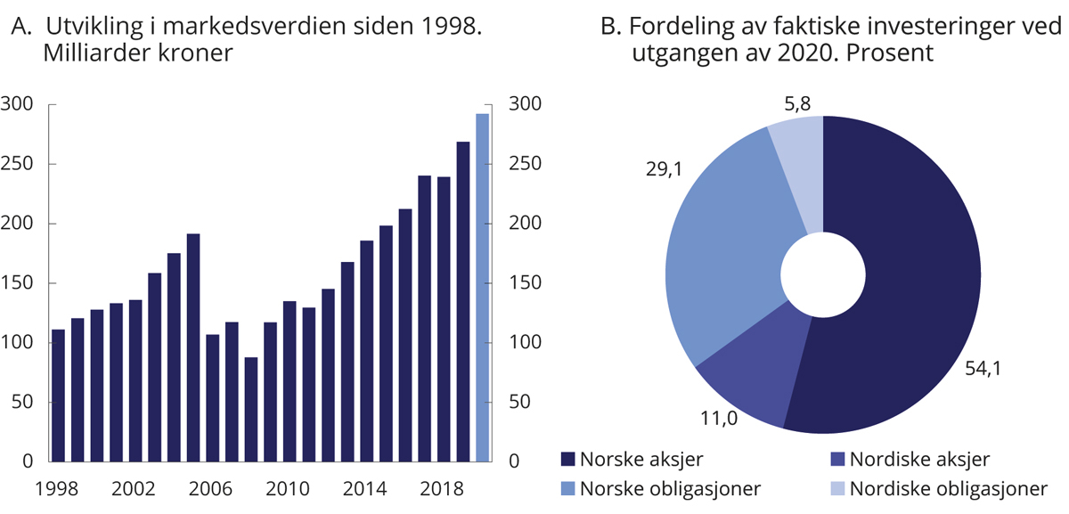 Ved utgangen av 2020 bestod finansieringen av 57 pst. aksjer og 43 pst. obligasjoner.
