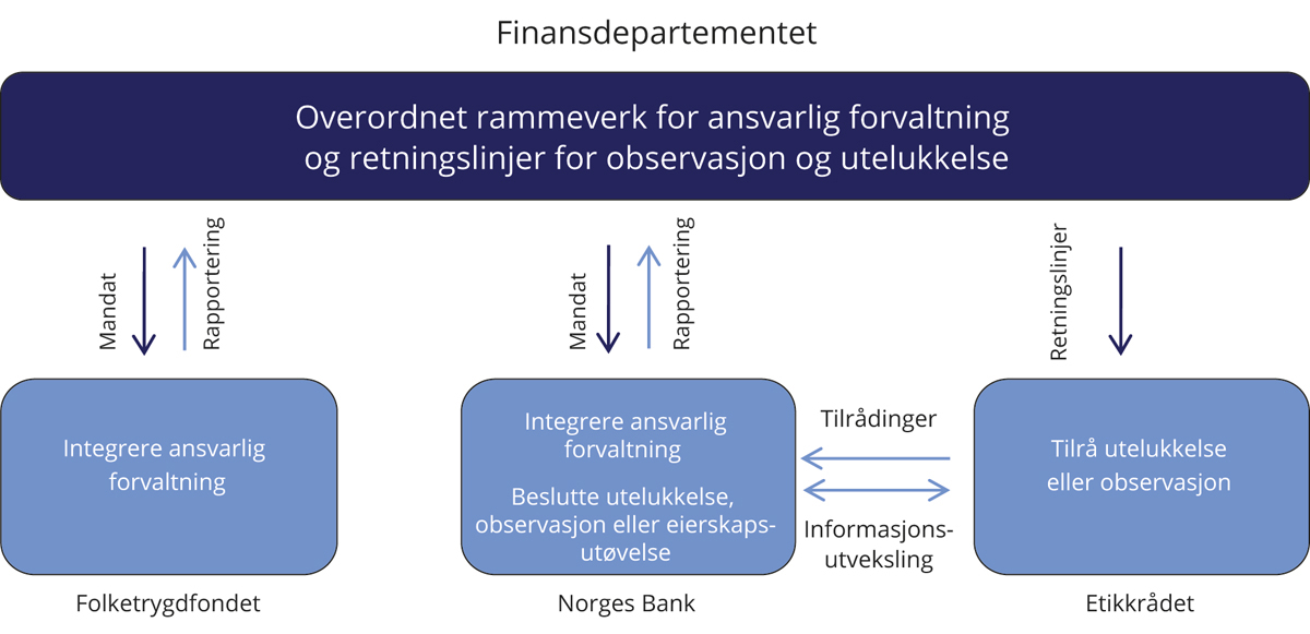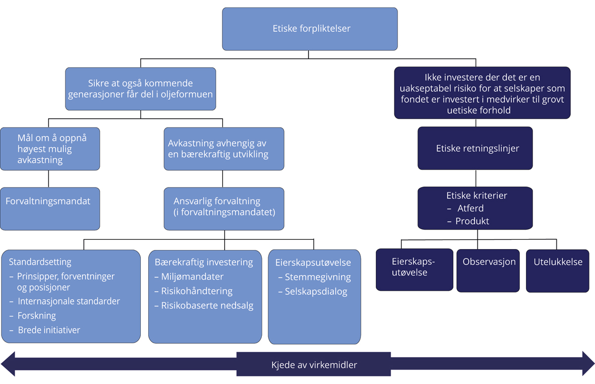 Norges Bank og Folketrygdfondet tar beslutninger om enkeltinvesteringer og utøver fondets eierrettigheter uavhengig av departementet. Viktige virkemidler i den ansvarlige forvaltningen er å fremme prinsipper og forventninger basert på internasjonalt anerkjente standarder, dialog med selskaper om aktuelle tema og saker, samt å stemme på generalforsamlinger i selskaper fondene er investert i. Risikohåndtering er også en viktig del av den ansvarlige forvaltningen.