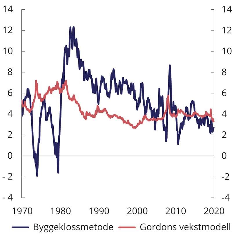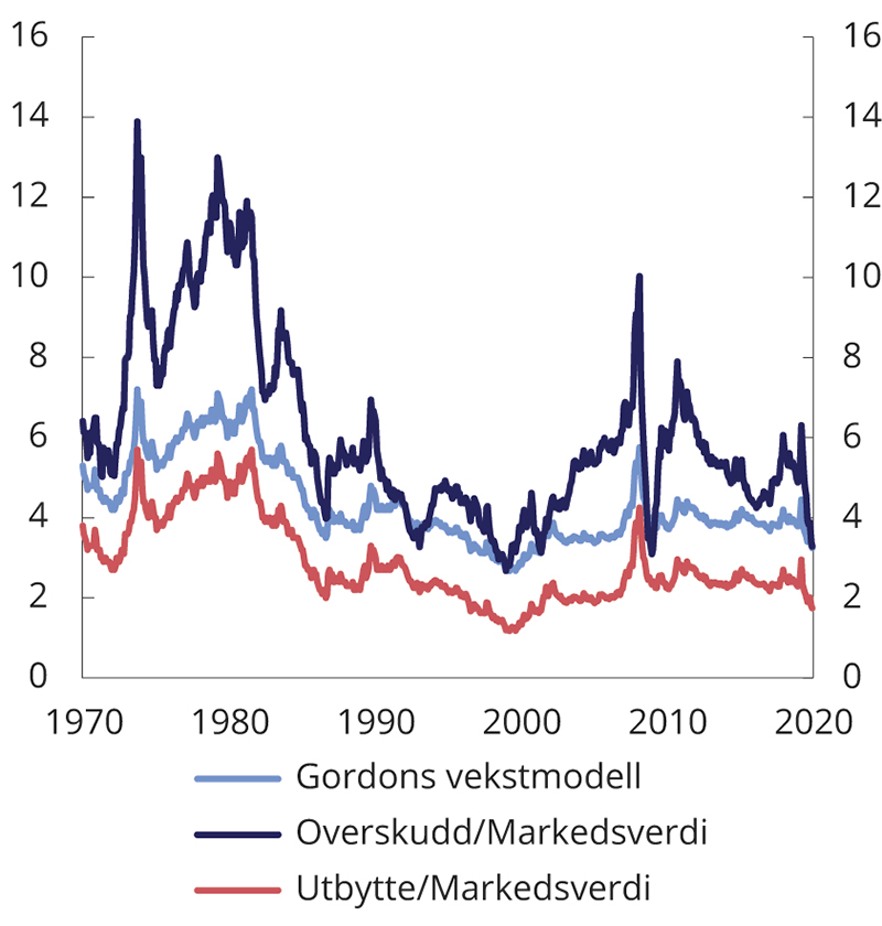 En mye brukt metode for å beregne forventet avkastning på basis av langsiktige kontantstrømmer er Gordons vekstmodell, hvor forventet avkastning anslås som løpende utbytter og trendvekst i disse.11 Metoden kan være godt egnet til anslag med en horisont på 20 år eller lengre.12 Vekstmodeller er imidlertid følsomme for anslaget for trendvekst i fremtidige kontantstrømmer. Denne trendveksten er som tidligere beskrevet knyttet til nivået på egenkapitalavkastningen.