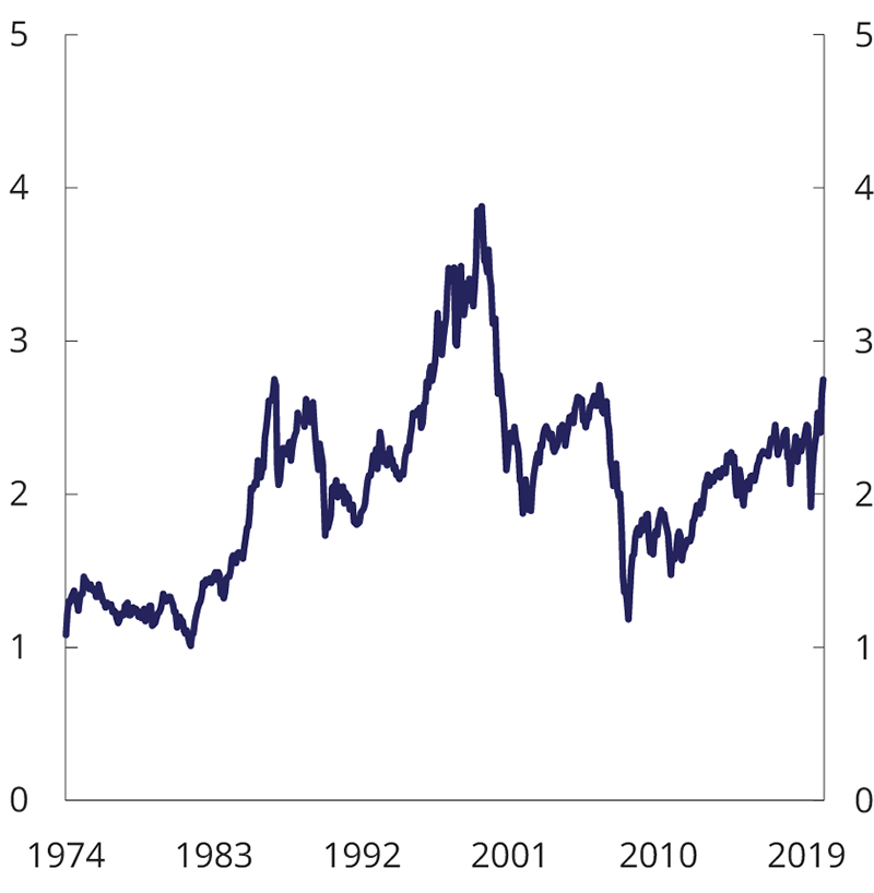 PE-raten viser markedsverdien av de globale aksjemarkedene i forhold til selskapenes overskudd eller syklisk justerte overskudd.3 PE-rater er et vanlig mål på verdsettelsen av aksjemarkedet og reflekterer investorenes betalingsvillighet for selskapenes overskudd. Det har historisk vært store variasjoner i PE-raten, og fra starten av 1980-tallet frem til årtusenskiftet steg den med om lag 350 pst., se figur 8.2. I slike perioder vil avkastningen i aksjemarkedene avvike betydelig fra utviklingen i selskapenes kontantstrømmer. Den sterke veksten i PE-raten fra starten av 1980-tallet frem til årtusenskiftet kan ses i sammenheng med det markerte rentefallet i perioden. I tillegg steg PE-ratene kraftig for flere selskaper innenfor sektorene media, telekommunikasjon og teknologi mot slutten av perioden. Siden årtusenskiftet har rentene fortsatt å falle, men uten at PE-ratene har steget. En forklaring kan være at investorenes forventninger til vekst i kontantstrømmene er redusert. En annen forklaring er at risikopremien har økt og gitt et høyere avkastningskrav. Empirisk forskning trekker i retning av at variasjoner i risikopremiene har vært viktigere for variasjoner i verdsettelsen enn investorenes forventninger til vekst i kontantstrømmer. Allerede tidlig på 1980-tallet ble det pekt på at markedsverdiene svingte langt mer enn kontantstrømmene.4 Hvis risikopremiene er høyere når PE-raten er lav, vil også forventet avkastning være høyere. Historisk synes det å ha vært en sammenheng mellom finansmarkedenes verdsettelse av overskudd og realisert avkastning 10 år frem i tid, men ikke over kortere horisonter.