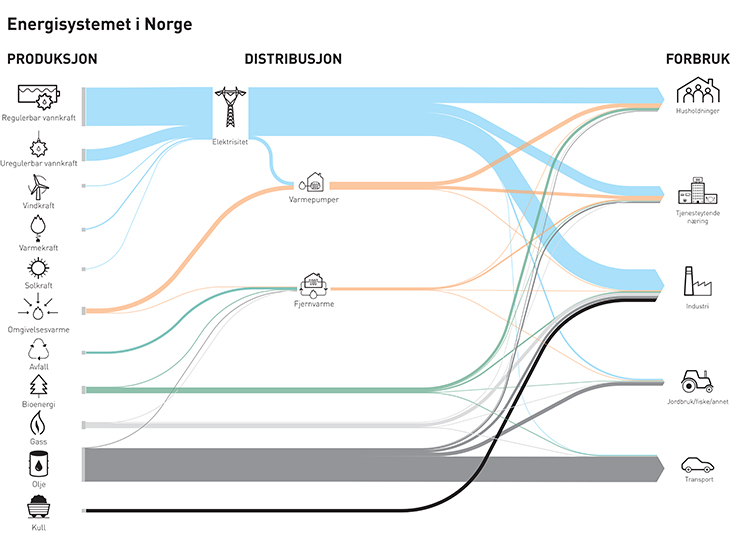 Jo mindre boksen er, desto mindre energi brukes i sektoren. Fargene representerer forskjellige energikilder. Arealene på de forskjellige fargene representerer også her mengden energi brukt av den aktuelle energikilden.