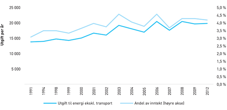 Husholdningenes utgifter til energi har økt siden 1991, jf. figur 2.10. I samme periode har inntektene til husholdningene økt, og dermed dempet virkningene av økte energiutgifter. Utgifter til energi utgjorde 3,1 prosent av inntektene i 1991. I 2012 utgjorde de 4,2 prosent. Veksten i utgiftene var størst frem til tidlig på 2000-tallet. Dette sammenfaller med en periode med økte energipriser og høyere energibruk per person i husholdningene.
