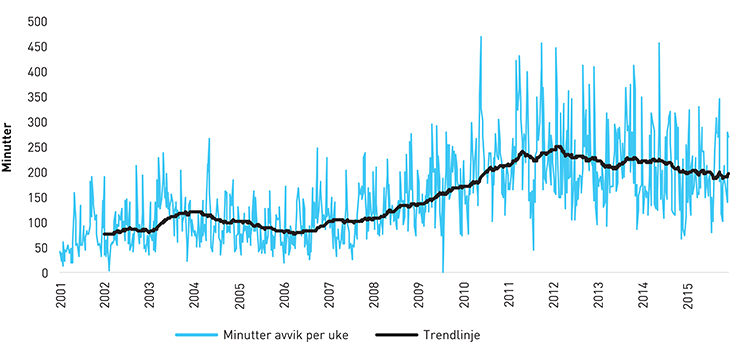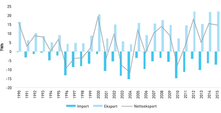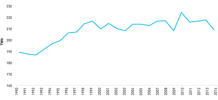Figur 2.2 Utvikling i netto innenlandsk energiforbruk, 1990: 189 TWh; 2014: 209 TWh.