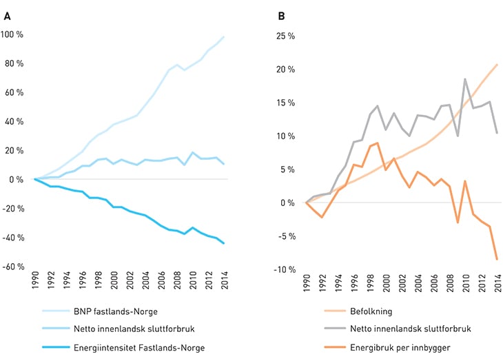 I løpet av de siste 25 årene har befolkningen i Norge vokst med 20 prosent, og verdien av den norske økonomien1 har nesten doblet seg. I samme tidsrom har sluttforbruket av energi i fastlands-Norge2 vokst med 10 prosent.