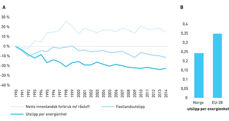 I perioden 1990–2014 økte netto innenlandsk sluttforbruk inkludert råstoff med over 14 prosent, samtidig som de tilhørende utslippene gikk ned med nesten 16 prosent, jf. figur 2.4a. Utslippene per enhet energibruk har dermed avtatt med over 26 prosent siden 1990. Dette gjenspeiler at sammensetningen av energibærere har endret seg. Bruken av energibærere som er forbundet med lite utslipp eller som er karbonnøytrale, slik som elektrisitet, fjernvarme og bioenergi, har økt eller ligger fast. En konvertering fra fossil energikilder til elektrisitet innebærer både en effektivisering av energibruken gjennom forbedret virkningsgrad, og reduserte utslipp. I tillegg har forbruket av fossile energikilder endret sammensetning. Bruken av kull og koks og de tyngste petroleumsprodukter har avtatt, mens gass- og dieselforbruket har økt.