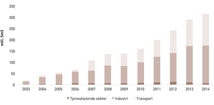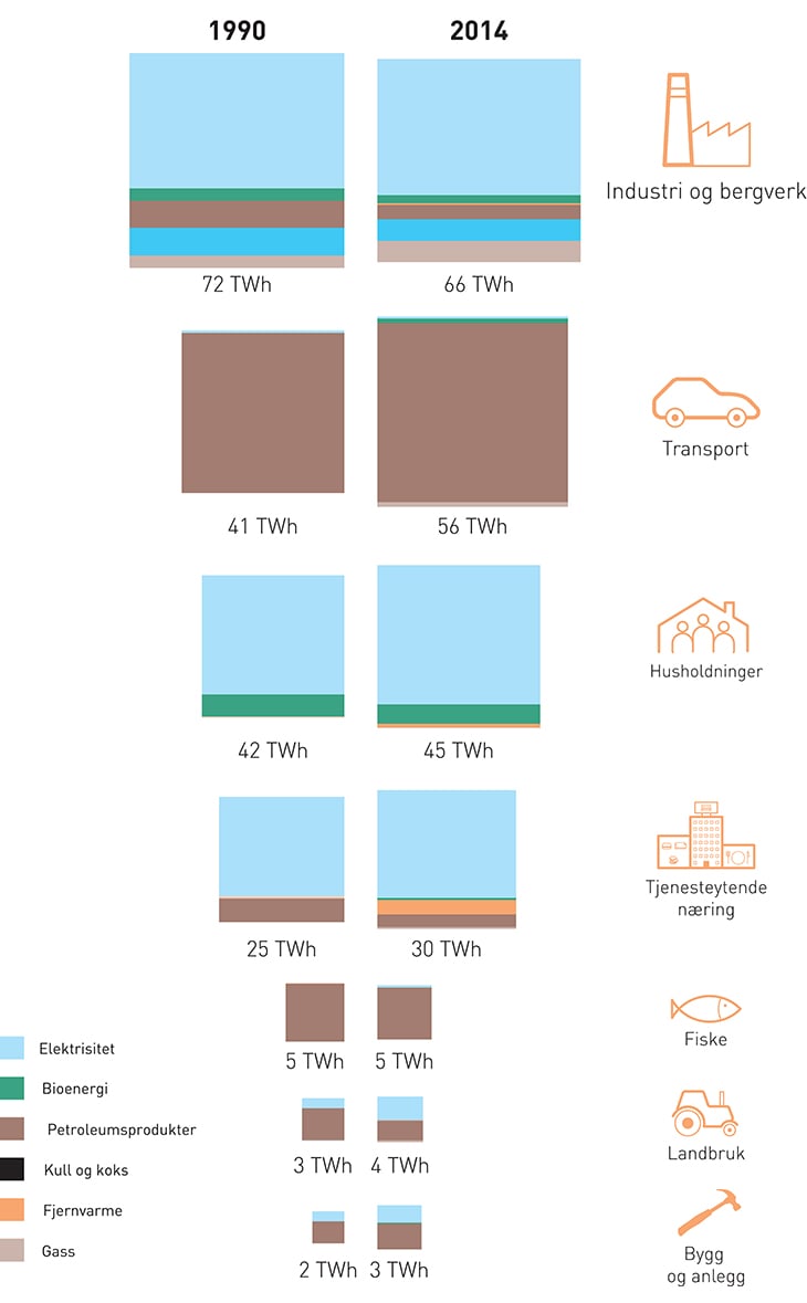 Figur 2.6 viser sammensetningen og størrelsen på energibruken i de ulike sektorene i 1990 og 2014. Netto innenlandsk sluttforbruk av energi i Norge utgjorde 209 TWh i 2014, en økning på om lag 20 TWh fra 1990. Industri, bergverk og transport har gjennom hele perioden hatt det høyeste sluttforbruket av energi i Fastlands-Norge. Tjenesteytende sektor og husholdninger har vært de nest største forbrukerne, mens øvrige sektorer som bygg- og anleggssektoren, landbruk og fiske, har utgjort en mindre andel av energibruken.