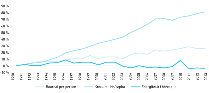Verdien av privat konsum per person har nesten doblet seg i perioden, og boligarealet per person har økt med over 25 prosent. Likevel har energibruken per person gått ned med nesten 4 prosent siden 1990. Årsaker til denne utviklingen er bedre varmeisolering av bygg, at elektriske apparater har blitt stadig mer energieffektive og at bruken av varmepumper har økt.