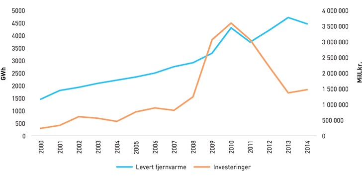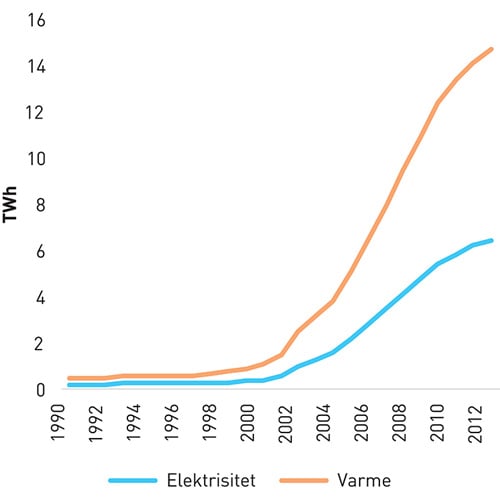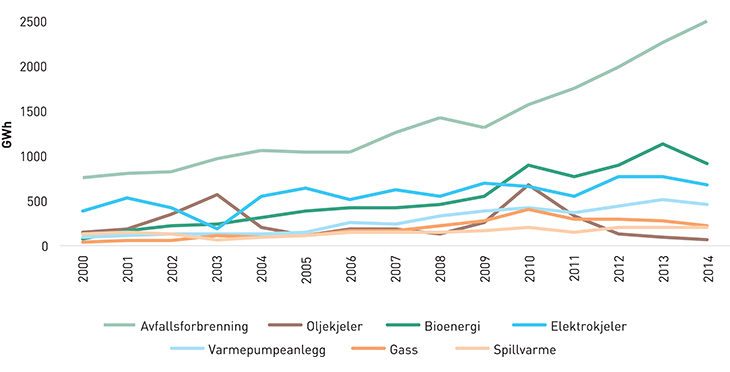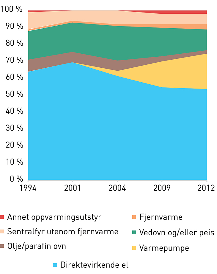 Elektrisitetsandelen i oppvarming av bygg varierer mellom 70 og 80 prosent, avhengig av blant annet pris. Ved siden av elektrisitet har olje- og vedfyring tradisjonelt dekket mesteparten av det resterende oppvarmingsbehovet. Oljefyring har vært utbredt både i boliger og i øvrige bygg, mens vedfyring i hovedsak har funnet sted i private boliger. De senere årene har det vært en omlegging av energibruken i bygg, fra fossile energikilder til bruk av elektrisitet, fjernvarme og varmepumper. Salget av fyringsoljer og fyringsparafin har sunket med over 60 prosent siden 1990, til om lag 2,7 TWh i 2014. Samtidig har fjernvarmeleveranser økt fra 0,8 TWh til 4,7 TWh, og estimert varmeproduksjon fra varmepumper har økt fra 0,4 TWh til om lag 15 TWh i samme periode, jf. figur 2.9.