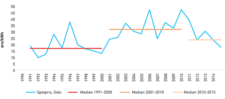 Samlet sett har utviklingen de siste 25 årene ført til at den norske økonomien gradvis har blitt mindre energiintensiv. Figur 2.3 viser at energiintensiteten i norsk økonomi har sunket med over 40 prosent siden 1990. Dette tyder på en svakere kobling mellom de underliggende trendene for økonomisk vekst og energibruk i Norge de siste 25 årene.