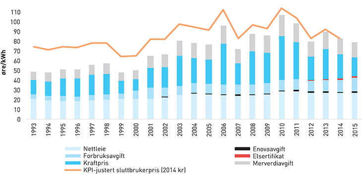 Også i husholdningene utgjør elektrisitet mesteparten av energibruken. Andelen elektrisitet har gått opp fra 73 prosent i 1990 til 83 prosent i 2014. Dette skyldes blant annet flere elektriske apparater og nær utfasing av bruken av fossile energikilder til oppvarming5. Fossilbruken var fire ganger høyere i 1990 enn i 2014.