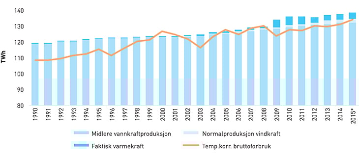 Samlet norsk energibruk omfatter energibruk innenlands og på norsk sokkel1. I 2014 lå dette på om lag 305 TWh.