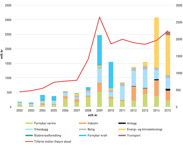 Utviklingen reflekteres også i at utslippene fra energibruken i industri og bergverk har gått ned. Utslippene er redusert fra i overkant av 17,7 mill. tonn CO2-ekvivalenter i 1990, til om lag 9,8 mill. tonn CO2-ekvivalenter i 2014. Dette er en nedgang på 40 prosent, og innebærer en lavere utslippsintensitet per energienhet i industriens produksjon.