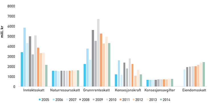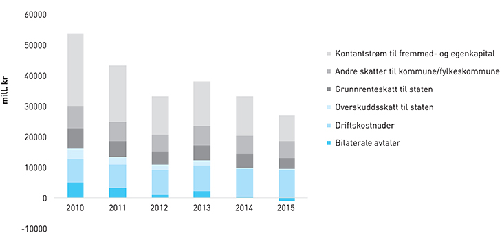 Norges innenlandske energibruk er forbundet med lavere utslipp enn i mange andre land, også når olje- og gassektorens utslipp fra energibruk inkluderes jf. figur 2.4. Dette skyldes at norsk elektrisitetsproduksjon er fornybar og at Norge har en stor andel elektrisitet i sluttforbruket sammenliknet med andre land. Samlede norske utslipp av klimagasser var 53,2 mill. tonn CO2-ekvivalenter i 2014, opp fra 51,9 mill. tonn CO2-ekvivalenter i 1990. Utslippene forbundet med innenlandsk energibruk var 34,9 mill. tonn CO2-ekvivalenter i 2014. De resterende utslippene er knyttet til olje- og gassutvinning (14,7 mill. tonn CO2-ekvivalenter) og energiproduksjon, inkludert raffinering (3,6 mill. tonn CO2-ekvivalenter).