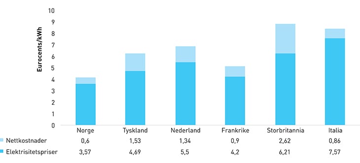 I forhold til andre europeiske land ligger Norge litt under gjennomsnittet i hvor stor andel av inntektene vi bruker på energiutgifter. Norge har lave elektrisitetspriser, men vi bruker mer elektrisitet der andre land bruker gass og andre energibærere til oppvarming. Gjennomsnittlig elektrisitetsforbruk per husholdning i EU ligger på mellom 2 500 og 5 000 kWh i året. For en gjennomsnittlig europeisk husholdning var sluttbrukerprisen på elektrisitet i 2013 1,9 kr/kWh, mens den for en gjennomsnittlig norsk husholdning med et forbruk på 16 000 kWh, var 1,1 kr/kWh.