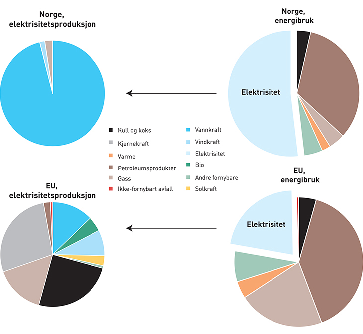 Tilgangen på relativt billig vannkraft har formet energibruken vår, og Norge er i dag mer elektrifisert enn de fleste andre land. Norge har en stor kraftintensiv industri, og elektrisitet blir i mye større grad enn i andre land benyttet til oppvarming av bygninger og tappevann. Bruken av fornybar elektrisitet gjør at det er lave klimagassutslipp knyttet til norsk stasjonært energibruk.