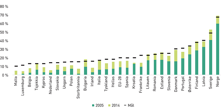 Norge har som utgangspunkt en betydelig høyere andel fornybar energi enn andre europeiske land. Dette innebærer at økt energibruk vil måtte dekkes opp av betydelig mer fornybar energi enn om vi hadde hatt en andel på nivå med gjennomsnittet i EU. Hvis energibruken øker, må 67,5 prosent av økningen dekkes opp av ny fornybar energi for at fornybarandelen skal opprettholdes. For å øke fornybarandelen i Norge må dermed veksten i utbygd fornybar elektrisitet være en god del høyere enn veksten i etterspørselen.