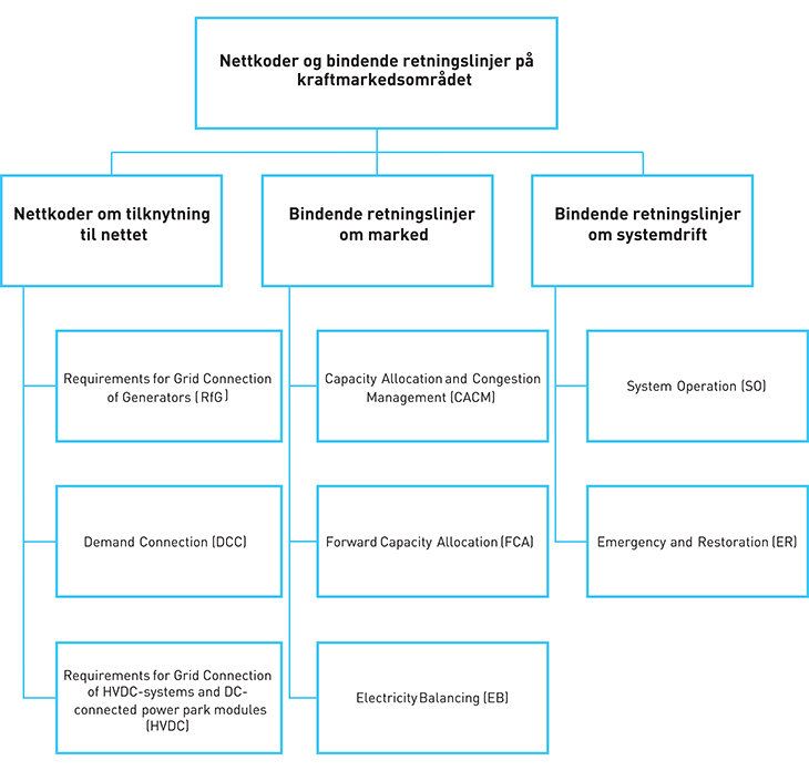 Mer integrerte fysiske elektrisitetsmarkeder forutsetter økt harmonisering av teknisk regelverk, handelssystemer og markedsdesign. Tredje energimarkedspakke hjemler og introduserer en prosedyre for utvikling av utfyllende regelverk, såkalte nettkoder og bindende retningslinjer. Prosedyren omfatter ENTSO-E, ACER og Kommisjonen. Det pågår nå et omfattende arbeid i EU med å utvikle utfyllende regelverk, i første omgang innenfor temaene nettilknytning, systemdrift og markedsdesign. Figur 6.4. gir en oversikt over nettkoder og bindende retningslinjer på elektrisitetsområdet.