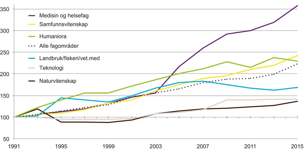 Figur 2.2 Utvikling i driftsutgifter til FoU i universitets- og høyskolesektoren og instituttsektoren, etter fagområde. 1991–2015. Faste priser, indeks 1991=100