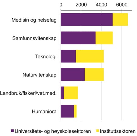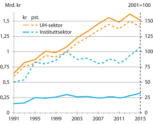 I figur 2.3 vises fordelingen av antall FoU-årsverk på henholdsvis universitets- og høyskolesektoren og instituttsektoren innenfor hvert fagområde. Humaniora er fagområdet der universitets- og høyskolesektoren spiller størst rolle, med 84 prosent av FoU-årsverkene og 82 prosent av FoU-utgiftene i 2015. Mens den prosentvise utviklingen i de to sektorene var omtrent lik mellom 1991 og 2001, har det senere vært en betydelig økning i FoU-utgiftene innenfor humaniora i universitets- og høyskolesektoren, mens utgiftene i instituttsektoren har hatt en mer ujevn utvikling og alt i alt økt langt mindre.