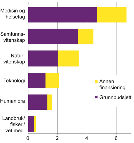 Figur 2.5 og 2.6 viser fordelingen av FoU-utgiftene i universitets- og høyskolesektoren på finansieringskilder for de ulike fagområdene. Andelen offentlig finansiering er høyere i Norge enn i mange andre land. Årsaken er høye grunnbevilgninger, mens andelen annen offentlig finansiering ligger rundt medianen. I humaniora var andelen som ble finansiert over grunnbevilgningen, 81 prosent i 2015. Det er noe høyere enn i samfunnsvitenskap og medisin og helsefag, der den var henholdsvis 76 og 71 prosent. Finansiering fra Forskningsrådet utgjorde 11 prosent av FoU-utgiftene innenfor humaniora i 2015, omtrent tilsvarende andel som i samfunnsvitenskap og medisin og helsefag. Andelen finansiering fra EU var 1 prosent, litt lavere enn i samfunnsvitenskap og medisin og helsefag, der den var 1,3 prosent.