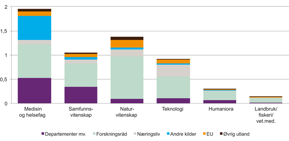 Figur 2.6 FoU-utgifter i universitets- og høyskolesektoren, etter fagområde og finansieringskilder utover grunnbudsjett. 2015. Mrd. 2015-kr