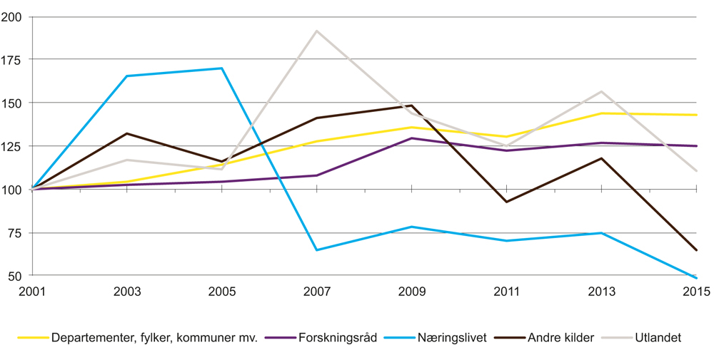 I figur 2.7 vises FoU-utgiftene i humaniora fordelt på finansieringskilder, inkludert FoU i instituttsektoren. Av de store finansieringskildene er det særlig finansiering fra departementer mv. (inkl. grunnbevilgninger) som har økt gjennom de siste tiårene. Etter 2005 har det vært realvekst også i forskningsrådsfinansieringen, med en noe høyere vekstrate enn for alle finansieringskilder sett under ett. I prosent har veksten i visse perioder vært størst for finansiering fra utlandet, som i hovedsak er EU-finansiering. Finansieringen fra utlandet har de siste årene vært mellom 20 og 40 millioner kroner i 2015-priser. Finansieringen fra næringslivet ble omtrent seksdoblet fra 1995 til 2005, en økning på rundt 100 millioner kroner. Siden har den gått kraftig ned igjen og var i 2015 på under en tredjedel av nivået i 2005, med 33 millioner kroner.