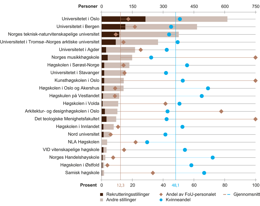 I universitets- og høyskolesektoren arbeidet 12 prosent av det samlede FoU-personalet i 2015 innenfor humaniora. Kvinneandelen var 48 prosent. Kvinneandelen blant professorene var 32 prosent. Av de største universitetene var det bare Norges teknisk-naturvitenskapelige universitet som hadde en lavere andel faglig ansatte innenfor humaniora enn gjennomsnittet i sektoren. Andelen var også lavere enn gjennomsnittet ved Nord universitet og Norges miljø- og biovitenskapelige universitet (som ikke hadde FoU-personale i humaniora). Av de største universitetene var andelen høyest ved Universitetet i Bergen (inkludert den tidligere Kunst- og designhøgskolen i Bergen) med 22 prosent, etterfulgt av Universitetet i Oslo med 18 prosent. Ved Universitetet i Agder var andelen av FoU-personalet i humaniora 25 prosent i 2015.