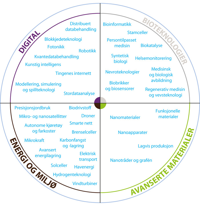 Også i dag står vi overfor teknologiske endringer som kan ha stor betydning for samfunn og hverdagsliv. OECD har nylig pekt på et stort antall fremvoksende teknologier som sammen forventes å forsterke hverandre og bidra til teknologiskifter med store konsekvenser for næringsliv, samfunn og hverdagsliv (se figur 7.1).17