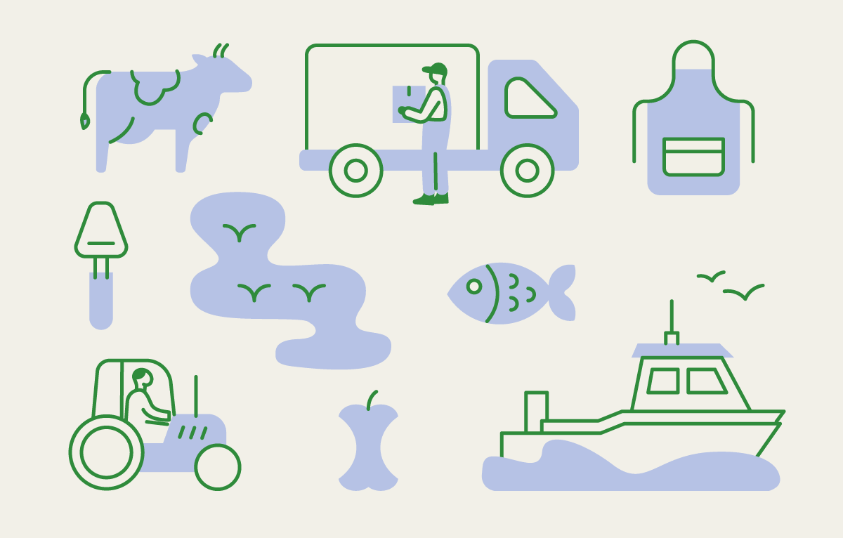 Mat fra havet kommer både fra oppdrett og fangst av ville bestander. Klimagassutslippene fra sjømat varierer mye på grunn av ulike produksjons- og fangstmetoder.16 Oppdrettsfisk har et lavere klimafotavtrykk enn kjøtt fra drøvtyggere, men høyere enn melk og kjøtt fra enmagede dyr som fjørfe og svin. Villfanget fisk har et av de laveste klimafotavtrykkene blant animalske proteinkilder. Oppdrett av arter som blåskjell og tare (lavtrofiske arter) gir svært lave klimagassutslipp i produksjonen siden produksjonen ikke bruker fôr. Regjeringen jobber for å redusere klima- og naturfotavtrykket fra fiskeri- og havbruksnæringen, både nasjonalt og globalt, og for å minske negative konsekvenser av klimaendringene for disse næringene.