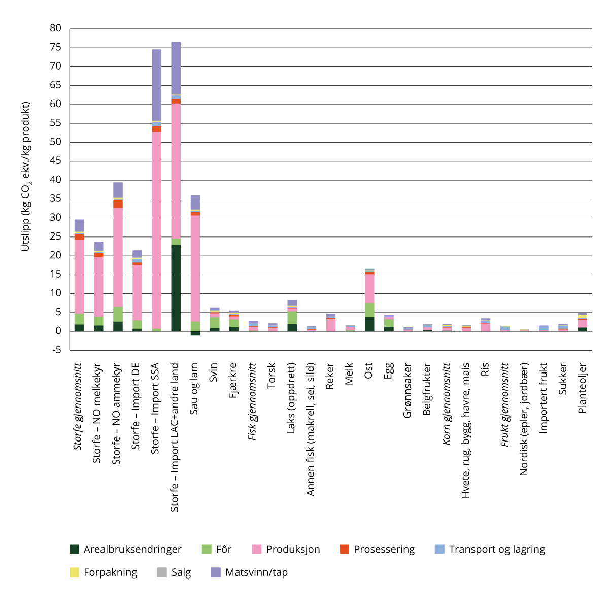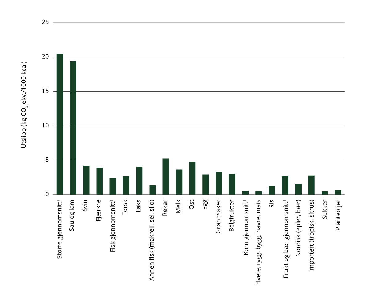 All matproduksjon fører med seg klimagassutslipp, men produksjon av ulike matvarer gir ulike klimagassutslipp per kilo produserte vare og har ulik påvirkning på natur. I et lavutslippssamfunn vil det fortsatt være utslipp som følger av biologiske prosesser knyttet til produksjon av mat, men utslippene kan reduseres ved å endre hvordan, hvor mye og hva som produseres. Plantebasert mat har i de fleste tilfeller lavere utslipp enn animalske produkter.Produksjonen av kjøtt fra drøvtyggerne storfe og sau gir høyere klimagassutslipp enn produksjonen av andre typer animalske produkter som svin, kylling og sjømat. Figur 10.4 viser klimagassutslipp per kilo produkt, fordelt over ledd i verdikjeden.