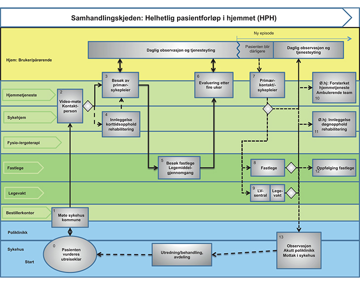 De hjemmebaserte tjenestene er godt utbygd i Norge og har brukere som trenger tjenester hele døgnet. Regjeringen mener hjemmetjenestenes potensial ikke er fullt utnyttet og vil arbeide for å styrke de hjemmebaserte tjenestene og deres samarbeid med øvrige helsetjenester slik at de kan håndtere mer komplekse tilstander. Det vil innebære at flere fastlege- og andre helsepersonellressurser kan følge opp pasientene hjemme i samarbeid med hjemmesykepleiere og andre i hjemmetjenesten, eventuelt i form av egne team for de mest skrøpelige. Som del av oppfølgingen av de mest skrøpelige med hyppige innleggelser bør det etableres planer for hvem som kontaktes når noe skjer. Den som kjenner pasienten kan vurdere pasienten før eller istedenfor legevakt, og eventuelt stå for oppfølgingen etter vurdering av legevakt. En faglig styrket hjemmebasert helse- og omsorgstjeneste kan være et viktig supplement til legevakt og øyeblikkelig hjelp døgntilbud. Ved godt samarbeid mellom disse tjenestene kan det etableres alternativ til innleggelse i sykehus eller et kommunalt øyeblikkelig hjelp døgntilbud. Forskning viser at behandling hjemme kan gi like gode eller endog bedre resultater enn innleggelse på institusjon. Det gjelder f.eks. ved forverring hos kolspasienter. Ved behandling i eget hjem unngås transport og miljøskifte som kan være en betydelig helsepåkjenning. Med utgangspunkt i sin følgeforskning på samhandlingsreformen (Norges forskningsråd 2014) har Anders Grimsmo, professor i samfunnsmedisin ved NTNU, stilt spørsmålet om man ved innleggelse i sykehus eller i kommunale øyeblikkelig hjelp døgntilbud oppnår bedre og mer helhetlige pasientforløp, eller bare en ytterligere og unødvendig oppsplitting av tjenestetilbudet.