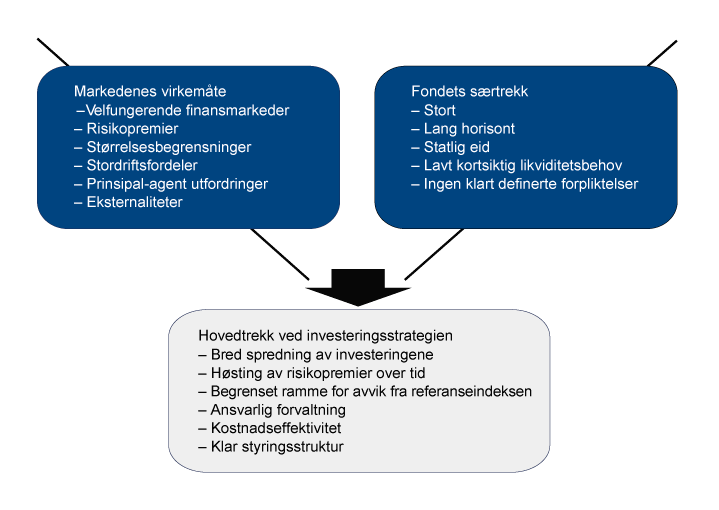 Målet med investeringene i Statens pensjonsfond er høyest mulig avkastning innenfor et risikonivå som skal være moderat. Det er bred politisk enighet om at fondet ikke skal være et virkemiddel i utenriks- eller klimapolitikken. Investeringsstrategien tar utgangspunkt i oppfatninger om hvordan finansmarkedene fungerer og i fondets formål og særtrekk. Strategien er blitt utviklet over tid basert på faglige utredninger, praktiske erfaringer og grundige vurderinger. Viktige veivalg er forankret i Stortinget. Det legger til rette for å holde fast ved en langsiktig strategi, også i perioder med uro i finansmarkene.