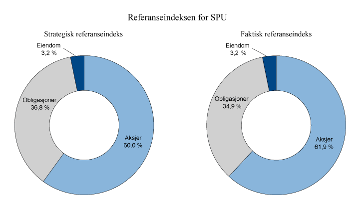 Aksjeandelen i den strategiske referanseindeksen er den enkeltbeslutningen som har størst betydning for forventet avkastning og risiko i SPU. Den siste vurderingen av aksjeandelen var i 2007. Da ble den besluttet økt fra 40 pst. til 60 pst. Fra 1. januar i år er aksjeandelen oppjustert til 62,5 pst. som følge av ny regulering av unotert eiendom. Andelen obligasjoner er 37,5 pst.