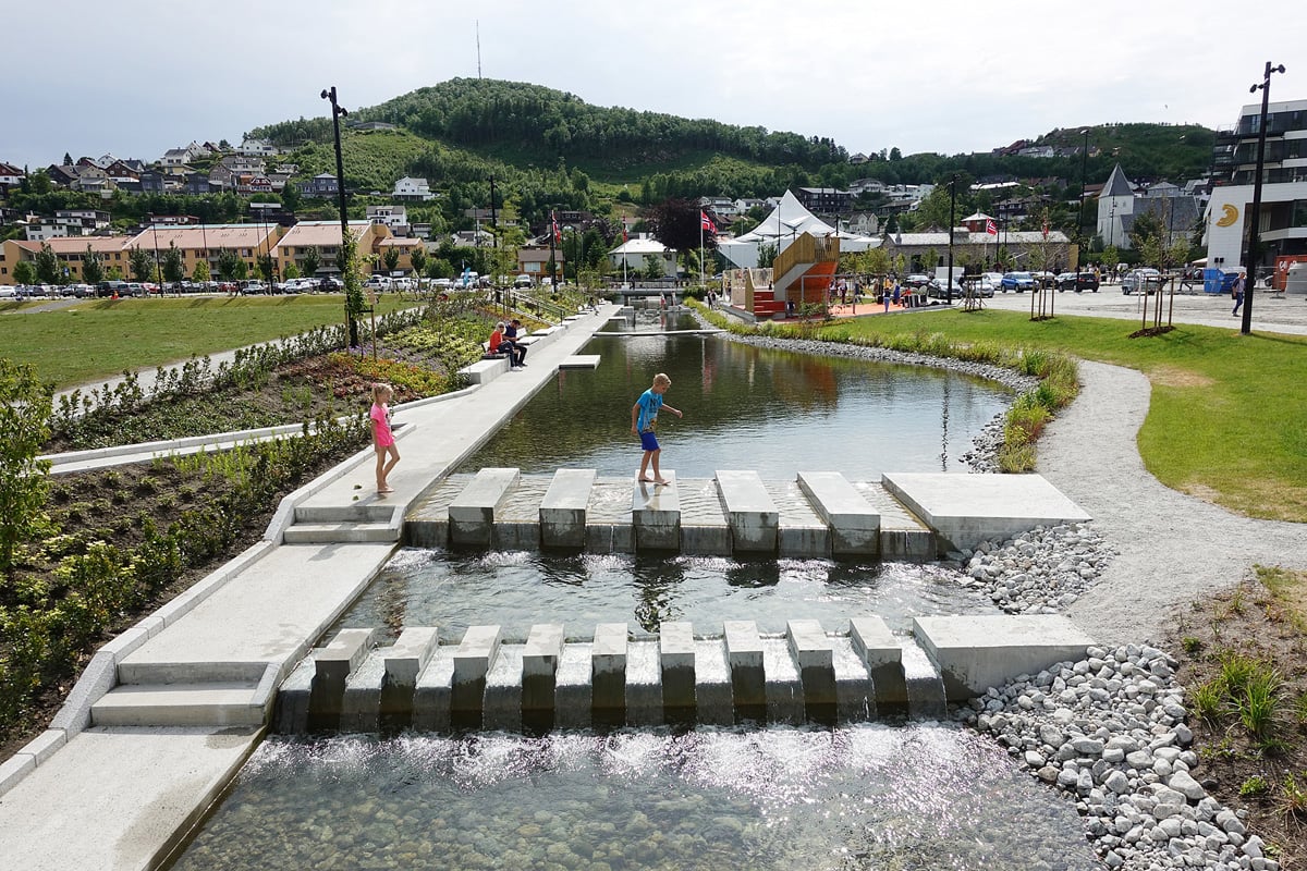 Transformasjonen av Ålgård sentrum i Gjesdal kommune viser hvordan man med god planlegging, samarbeid og medvirkning kan utvikle et tidligere industriområde til en attraktiv møteplass med opplevelser og aktiviteter for alle aldersgrupper. Prosjektet har trukket naturen inn i sentrumsområdet og økt områdets robusthet i møte med klimaendringene. På bildet sees kanalparken og gangstien langs Figgjoelva. Prosjektet vant Statens pris for byggkvalitet i 2019.