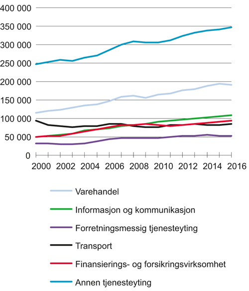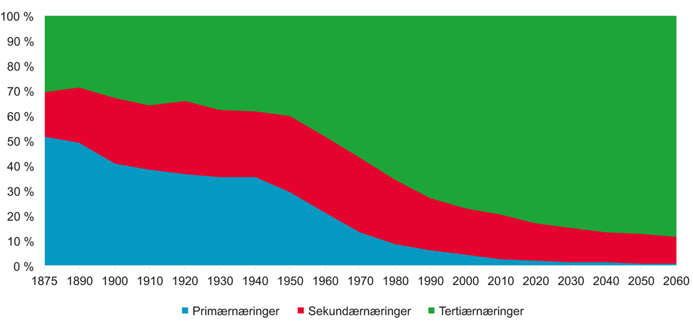 Som i andre industrialiserte land det er naturlig å sammenligne seg med, har tjenesteytende næringers andel av både sysselsetting og verdiskaping økt. Tjenesteytende næringer er i dag klart størst målt både i sysselsetting og verdiskaping. Nesten all sysselsettingsvekst har skjedd i offentlig sektor eller privat tjenesteyting i den senere tid. Teknologisk utvikling, handel og stadig tettere økonomiske forbindelser med andre land har vært viktige drivkrefter for denne utviklingen. Økt kjøpekraft og høyere levestandard bidrar til økt etterspørsel etter tjenester.
